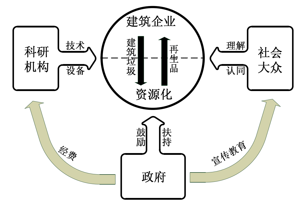 建筑垃圾資源化不能僅是建筑企業一家要考慮的事,它需要得到政府、社會大眾、科研機構等相關人員及團體的支持。建筑垃圾資源化由于剛起步,目前產生的利潤有限,受重視程度不高,但其社會與環境意義重大,因此,需要政府部門的扶持與幫助。此外,還需要社會大眾理解和科機構的技術支持。